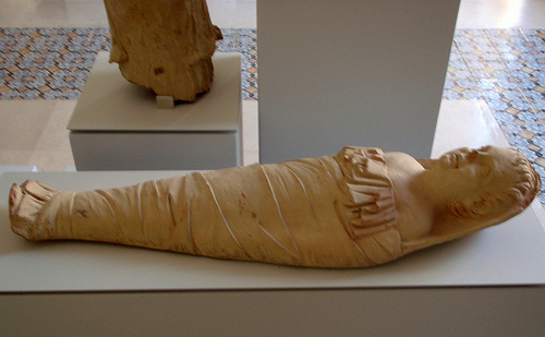 The back of most infant votives (but of course not all – some are moulded with swaddling bands to match the front, and one example I looked at even had tiny buttocks!) comprises a fairly flat surface which suggests that they were probably intended to be laid down, like babies in a cradle or perhaps, as some reconstructions suggest, propped up so that they were leant against a wall, cult statue or altar. This might initially seem a bit odd given that many of us would probably never dream of propping a very young baby up against something – in the UK at least we are more accustomed to leaving tiny babies lying on their back (or their tummy). But other swaddling cultures, especially those which produce quite rigid forms of swaddling using backboards or cradleboards, might find this a more logical thing to do, especially if parents are accustomed to carrying an infant in an upright manner, rather than cradled in the arms. So perhaps it should not be ruled out.