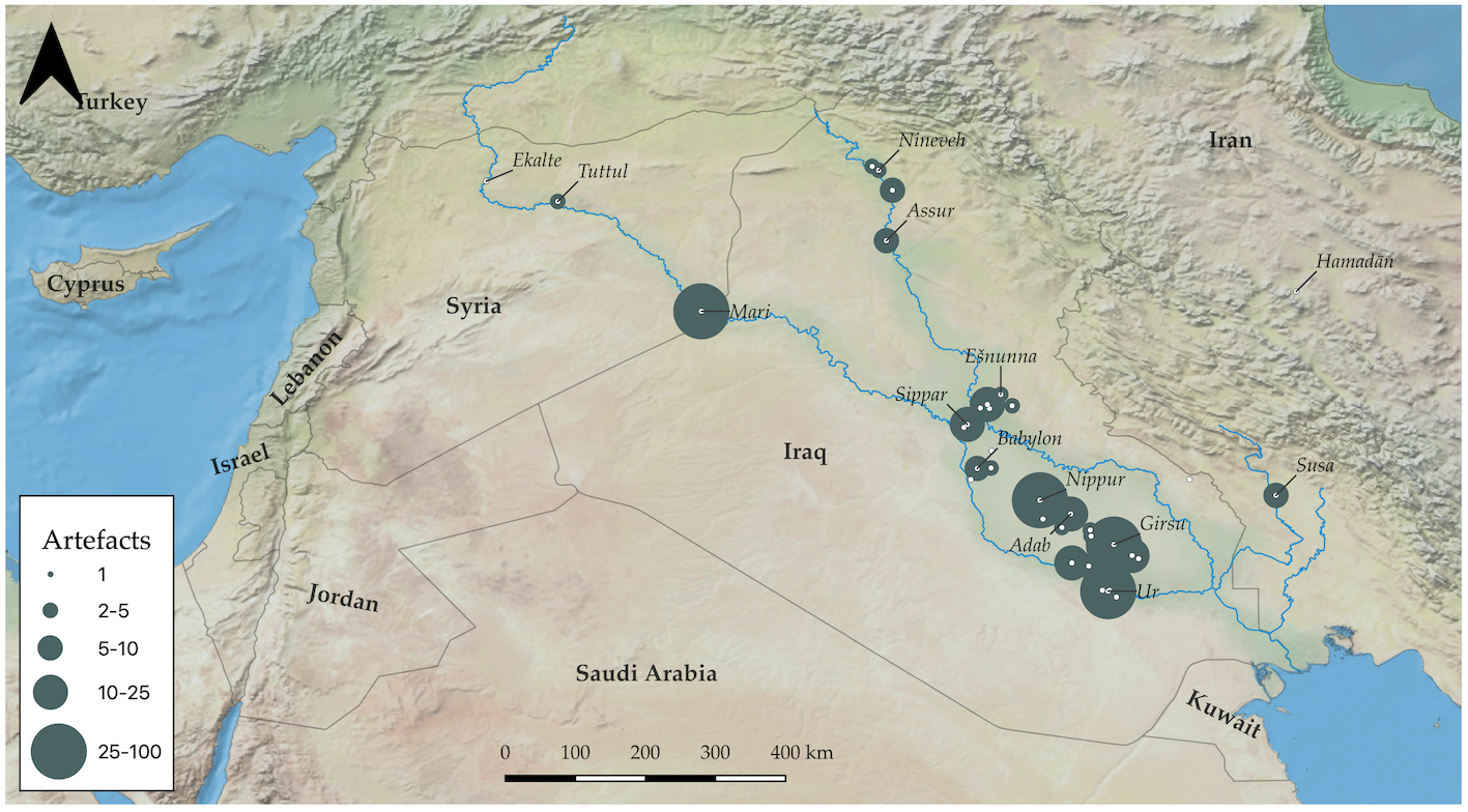 Our assembled catalogue of inscribed commemorative objects covers an area similar in size to northern Europe, with finds coming from places as far apart as Malta in the Central Mediterranean and Hamadān in western Iran. At the level of discrete archaeological sites, our c. 800 individual objects are distributed across c. 40 different locations, ranging from huge +1,000 hectares metropoles like Babylon or Nineveh down to small peripheral towns.