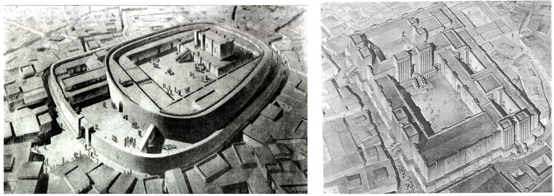 Figure 1. Left: Isometric drawing showing a reconstruction of the Early Dynastic Oval temple at Khafajah/Tutub. Courtesy of The Oriental Institute, University of Chicago. Right: Reconstruction of the temple of Ishtar-Kititum at Ischali, dated to the Isin-Larsa period. The worshippers had to climb up the stairs from the courtyard, enter another courtyard and turn right to reach Isthar’s shrine.