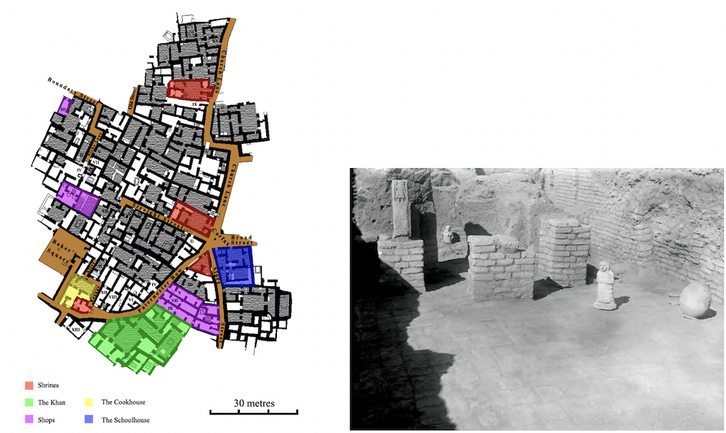 Figure 3. Left: Plan of Area AH at Ur during the Old Babylonian period (beginning of the 2nd mill. BCE), copyright Odyssey Adventures in Archaeology Right: Old Babylonian No. 1 Church Lane (known as AH House 3 or the Hendursag Chapel). This is the best preserved of the local chapels in the area AH at Ur. This field photograph shows the courtyard of that chapel with a statue in place and in the background, the sanctuary area, also with another statue in place. Courtesy of the British Museum. Taken after Hafford 2019, Fig. 7.9.