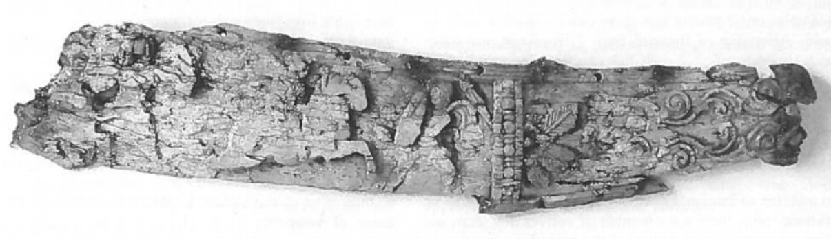 The increasing dedication of weapons as votives may speak to the construction of cultural memory around the cult; the dedication of weapons in the early period may have been preserved in memory as a key element of the cult, causing a greater number of weapons to be dedicated as this memory was passed down by the changing communities of Bactria. From the preservation of Seleucid era objects and continued dedications through the Kushan period, it is clear that there was a continuous line of votive practice at the site across almost five centuries (Lindström 2016, 305). Particularly fascinating among the preserved items are the miniature weapons, such as the ivory makhaira handle depicting Heracles in a lionskin (previously mentioned) and the ivory scabbard with relief decoration showing a mounted cavalryman charging a foot soldier (Pichikyan 1987, 46; Wood 2011, 145-6). As miniature items, these acted as semiotic signs representing their full-sized counterparts, but having undergone a process of ‘defunctionalisation’ that separates them from the everyday sphere (Pilz 2011, 24; Kiernan 2015, 45). These miniature examples underline the importance of dedication of weapons at the site, as they reflect a self-conscious choice to commission or purchase a votive object for the site in this form. Due to the habitual storage and deposition of votives in pits or the back corridors of the temple, it is difficult to know where they were originally displayed–it would make a considerable difference to the experience of the temple if these weapons were clearly displayed around the site in large numbers, shaping ongoing votive dedication and cult engagement (Litvinsky & Pichikyan 1994, 55; Lindström 2016, 292).