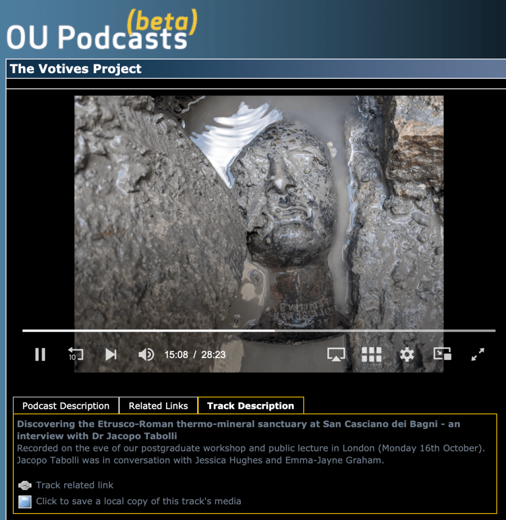 On the eve of our postgraduate workshop in ancient material religion and public lecture about the votive finds from San Casciano dei Bagni , we are delighted to share the recording of a conversation with our visiting speaker Dr Jacopo Tabolli. Tune in to hear about the latest excavations at the Etrusco-Roman thermo-mineral site of Bagno Grande at San Casciano dei Bagni – and some of the astonishing votive objects and inscriptions that have been discovered there.